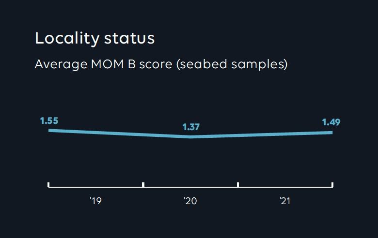 On the basis of these investigations, the individual location receives a score, which also provides an indication of when the next MOM-B investigation should be carried out. A poor score often requires more frequent seabed investigations than a good  score. In addition to MOM-B, analyses are also conducted locally at individual facilities. These include measurement of density, oxygen level in the sea, currents, water quality, visibility, dives etc.