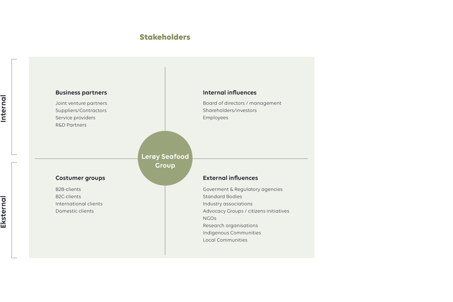 A stakeholder is an accountant, group, organisation, member or system who affects or can be affected by an organisation's actions. Lerøy Seafood Group has various stakeholders and communicates with these via meetings, annual reports, environmental reports, GRI reports, CDP reports, communication in the media, announcements, registrations, public reporting, joint projects, partnership agreements, the stock exchange, websites etc.