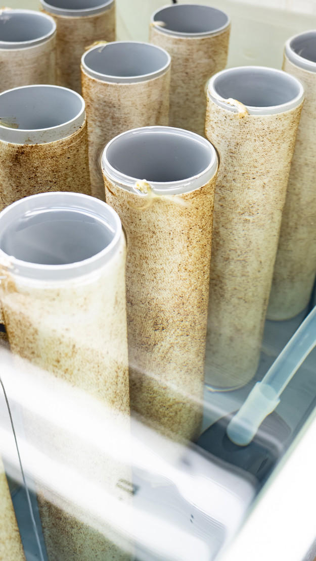 Stiklinger klar til å settes ut i havet. Her er de to mm lange, men skal bli to meter.