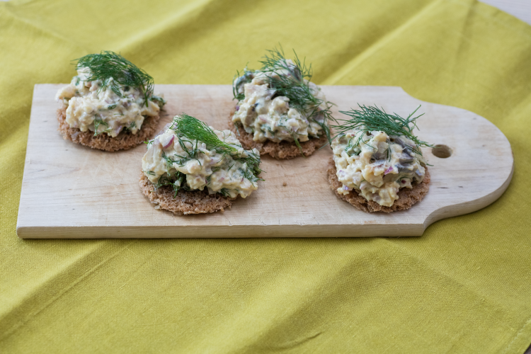 2. Finhakk torskefileten og ha i en bolle. Bland i krabbekjøttet fra skjellene og rør inn eggene, grovhakket dill og finhakket vårløk. Smak til med salt og pepper.